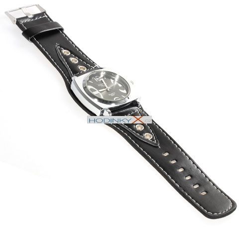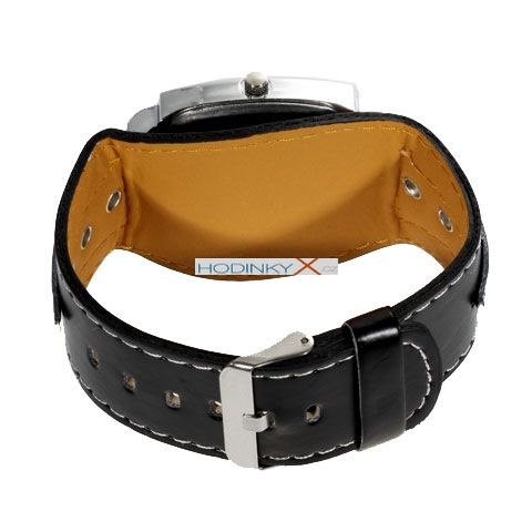 Černý ciferník se stříbrnými značkami a ručičkami pro snadné čtení.